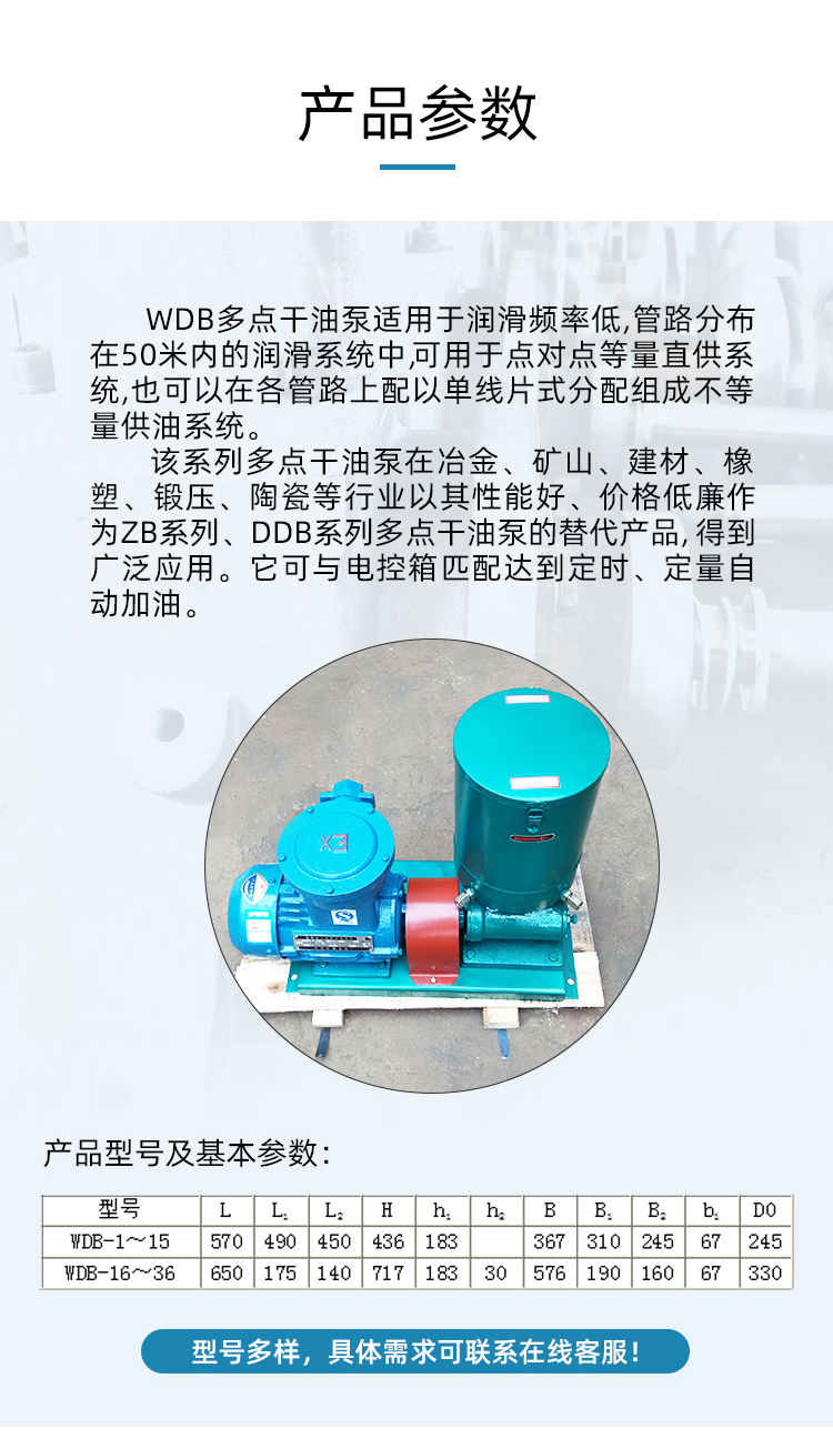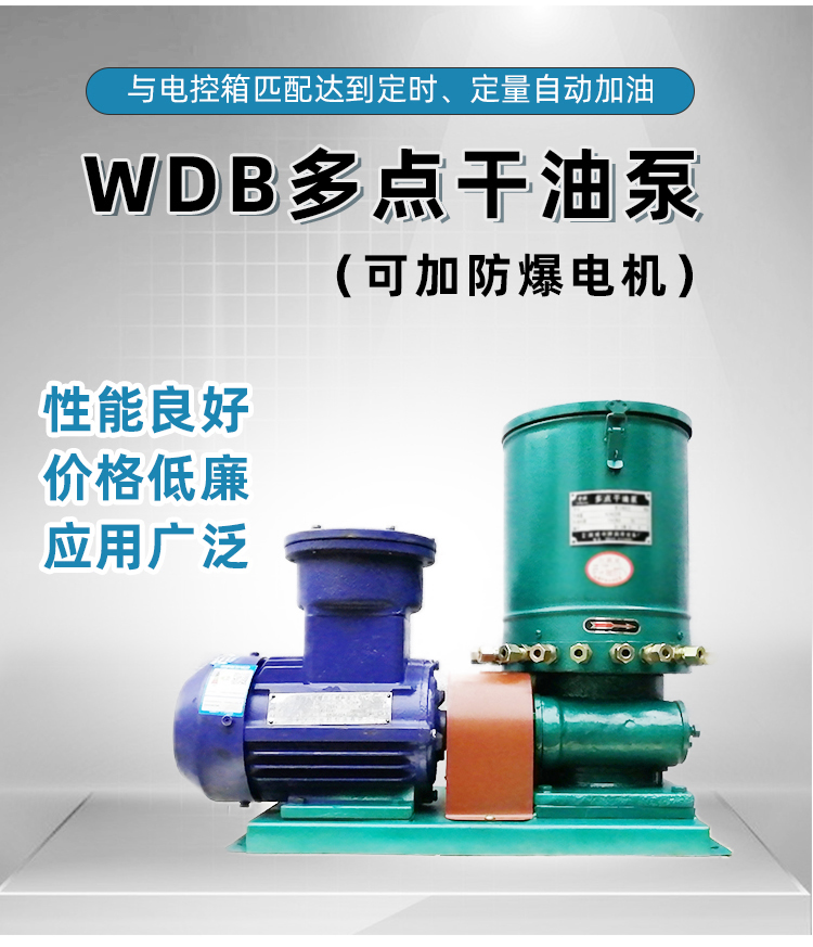 用途: WDB系列(lie)多點幹油泵适用(yòng)于潤滑頻率低,管(guǎn)路分布在50米内的(de)潤㊙️滑系統中,可用(yong)于點對點等量直(zhí)供系統,也可以在(zài)各管路上配以單(dan)線片式分配組成(chéng)不等量供油系統(tǒng)。