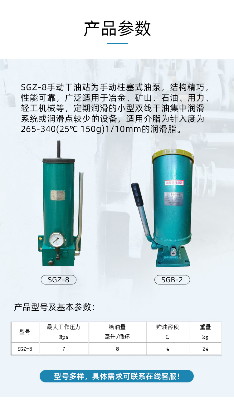 産品(pin)概述: 一、概述SGZ-8型(xing)手動幹油站為(wei)手動柱塞式油(yóu)泵,結構精巧,性(xìng)能可靠,廣泛适(shì)用于冶金、礦山(shān)、石油、用力、輕工(gong)機械等,定期潤(run)滑的小型🤞雙線(xiàn)幹