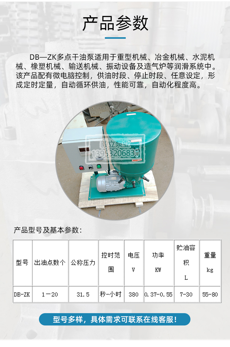 用(yong)途: DB — ZK 系列電(dian)動潤滑泵(bèng)适用于重(zhòng)型機械、冶(yě)金機械、水(shui)泥機械🈲、橡(xiang)塑機械、輸(shū)送機械、振(zhen)動設備及(ji)造氣爐等(děng)潤滑系㊙️統(tong)中。